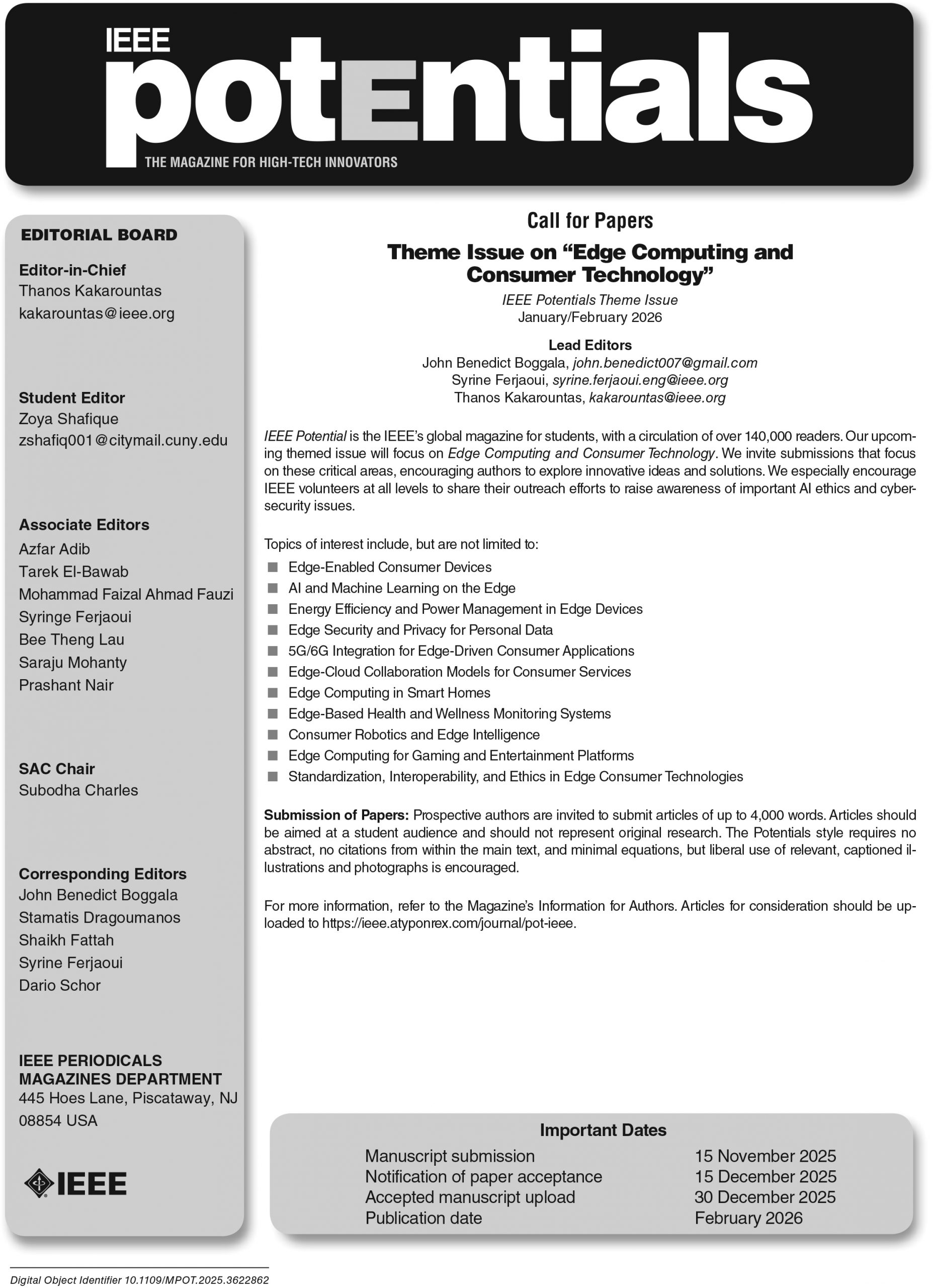 IEEE Potentials Magazine is the publication dedicated to undergraduate and graduate students, and young professionals. Potentials explores career strategies, the latest in research, and important technical developments. Through its articles, it also relates theories to practical applications, highlights technology’s global impact, and generates international forums that foster the sharing of diverse ideas about the profession.